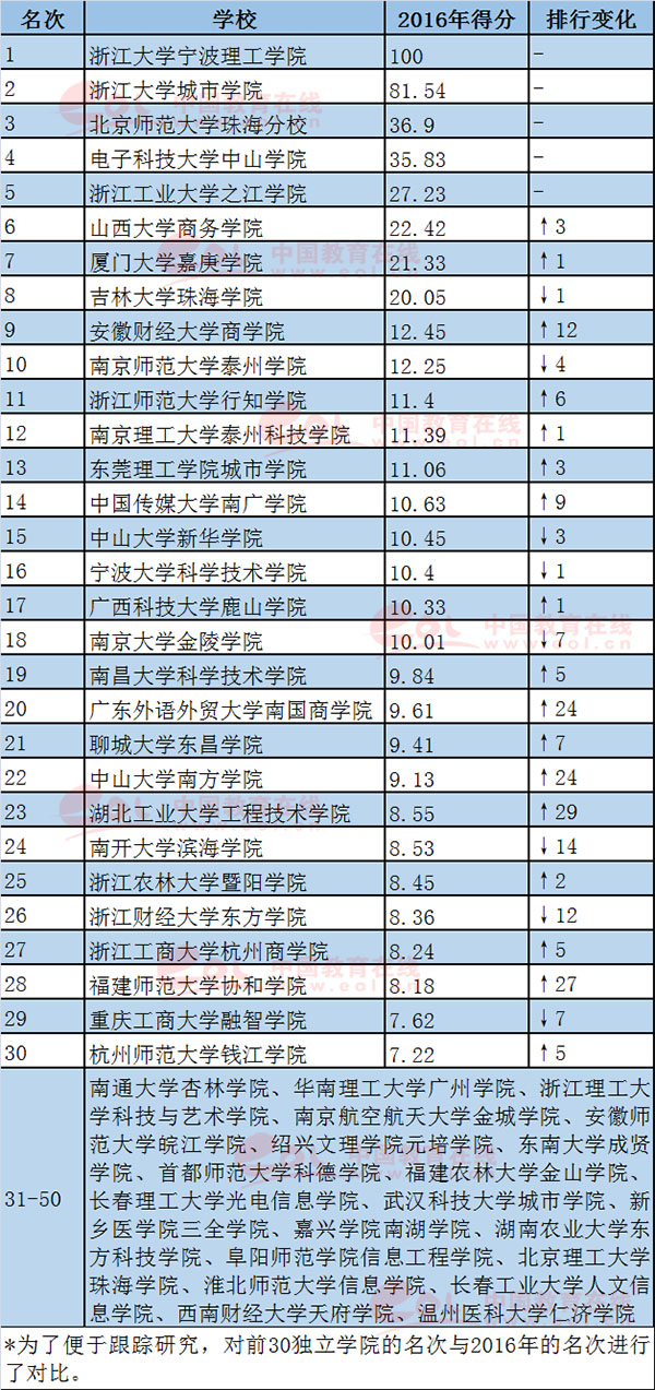 在“独立学院科研竞争力”排行榜中,浙江大学宁波理工学院、浙江大学城市学院、北京师范大学珠海分校、电子科技大学中山学院、浙江工业大学之江学院、山西大学商务学院位列前六。
