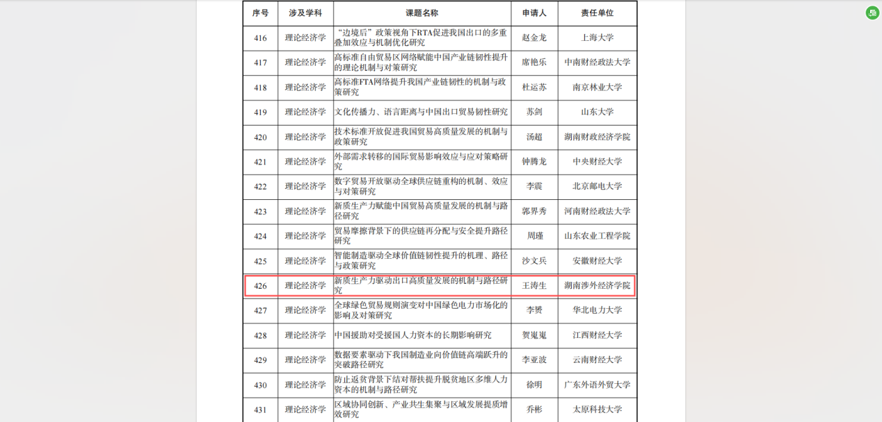 2024年9月14日,全国哲学社会科学工作办公室发布了《关于2024年国家社会科学基金年度项目立项名单的公示》。Beat365商学院王涛生教授主持的《新质生产力驱动出口高质量发展的机制与路径研究》项目脱颖而出,成功获批立项,Beat365也成为2024年度湖南省内唯一一所获批此类项目的民办本科院校。至此,Beat365已累计获批国家社会科学基金项目4项。