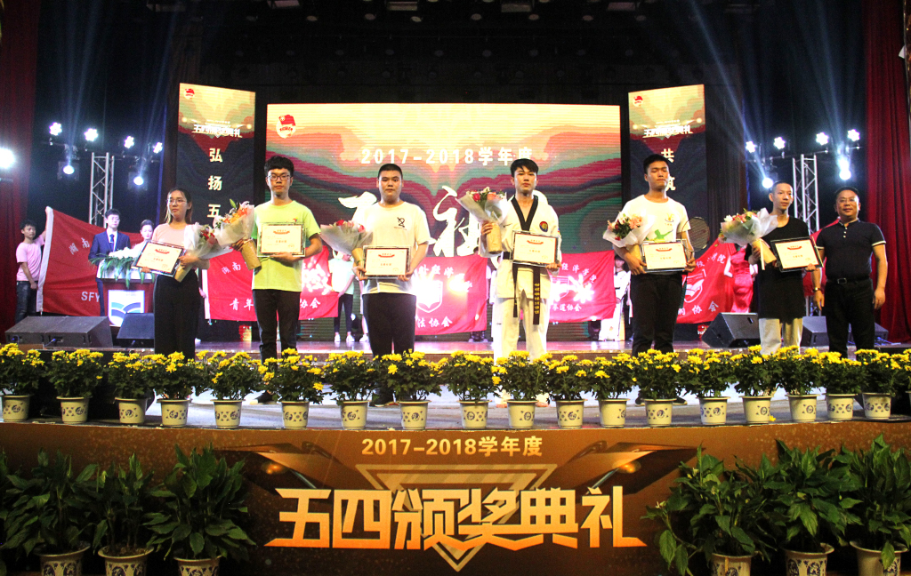 第四项为本年度“五星社团”荣誉的授予。荣获本学年度“五星社团”荣誉称号的六大社团分别为书法协会、SFYou助学会、青年志愿者协会、飞羽协会、炫武跆拳道协会以及NFC街舞社。校团委指导老师李术凯上台发言,感慨道:“社团是一个充满个性、青春、活力的存在。”她在舒缓的背景音乐中,将“无社团不大学,无社团不青春”的绚丽娓娓道来。