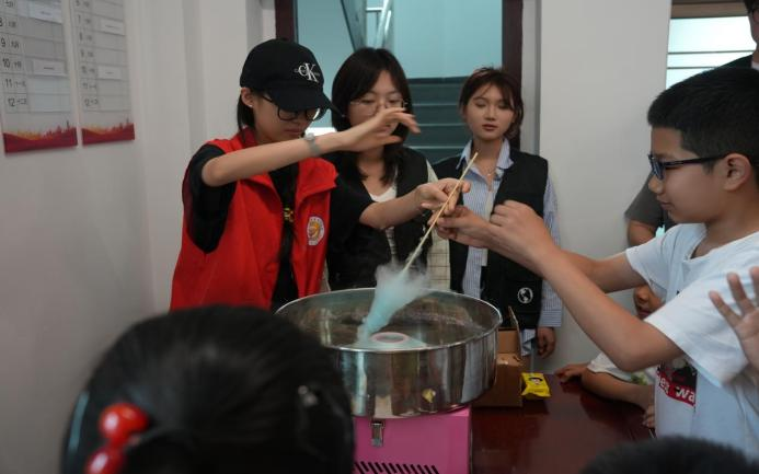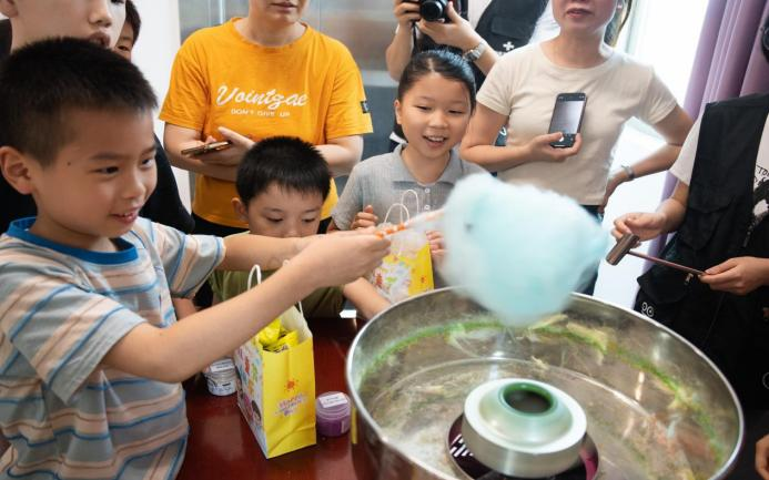 随后,棉花糖手工制作环节将活动推向高潮。在志愿者的耐心指导下,孩子们亲手操作制作工具,发挥创意制作出色彩缤纷的棉花糖。活动现场,孩子们互帮互助,甜蜜的香气与欢声笑语交织,洋溢着节日的欢乐氛围。