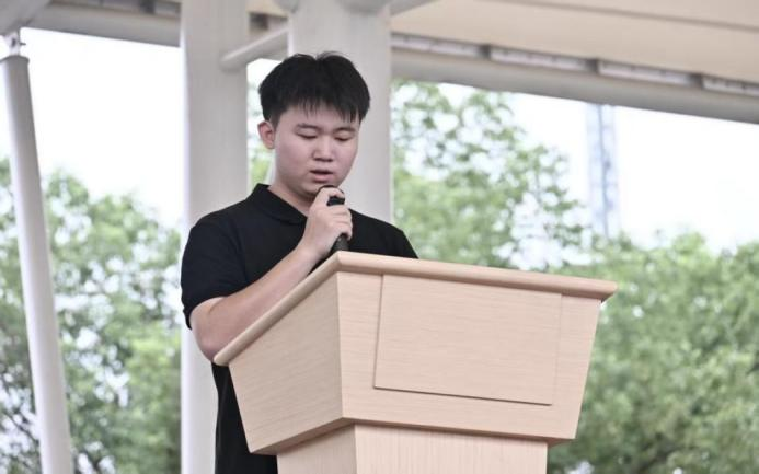 二营一连胥哲议作为新生代表发言,他代表全体2025级新生向学校、教官与老师的精心筹备表示感谢,并表示军训是大学生活的重要开端,不仅能锻炼体能,更是一次精神洗礼。全体新生将以教官为榜样,服从指挥、团结同学,用汗水展现涉外学子的青春风采,并将军训中收获的品质融入未来学习与生活。