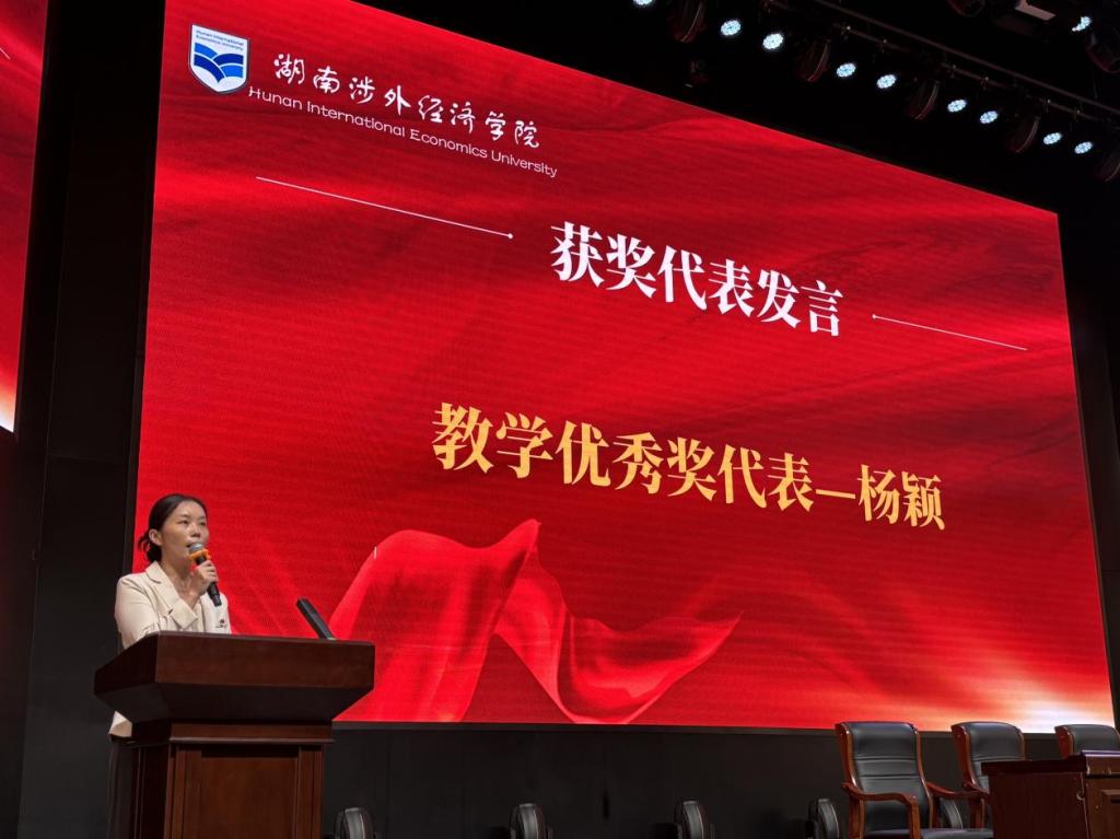 获奖教师代表杨颖发言,从“感恩平台托举、前辈引路、学生同行和自我坚守”四个方面,表达了对学院支持、团队协作和学生成长的深切感激,并表示将继续坚守育人初心。