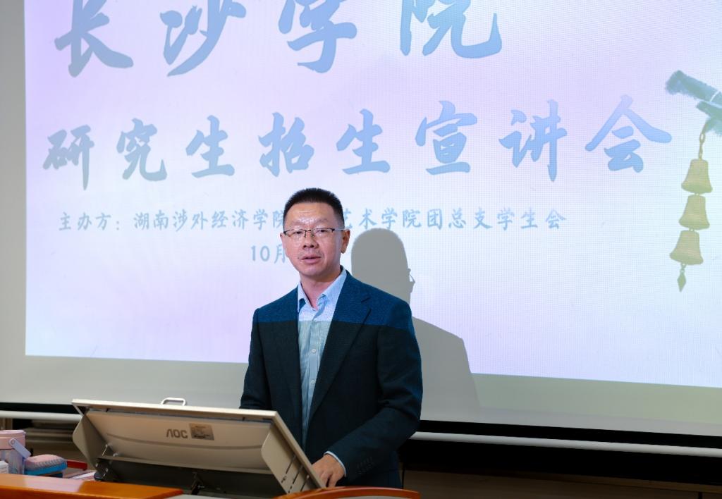 下午14时30分,宣讲会在人文艺术学院团总支书记龚钰婷的主持下拉开帷幕。人文艺术学院党总支书记廖立彬在致辞中,对长沙学院专家团队的到来表示热烈欢迎。他从“坚守艺术初心、树立备考信心、秉持实干精神”三个层面,鼓励同学们明确目标、科学备考,将个人发展与国家文化事业需求相结合,在艺术道路上持续深耕、行稳致远。