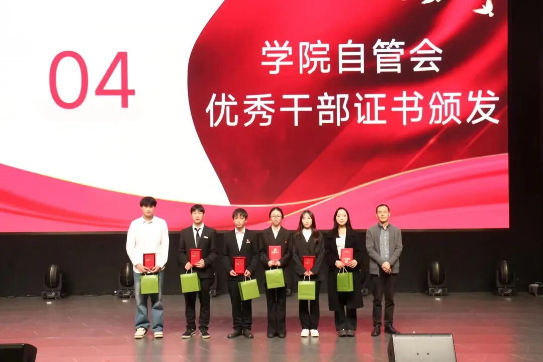 第七届校自管会主任杨子仪回顾了过去一年的工作成果,第八届干部代表宋锦璇作表态发言。会议对302名优秀学生干部进行了表彰,6名代表上台领奖,第八届校级、学院、楼栋自管会等各级干部代表上台领取聘书。大会还举行了合唱表演与集体宣誓仪式,全体成员承诺:心系组织、严守规矩、全心奉献,共筑美好社区环境。