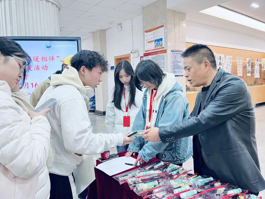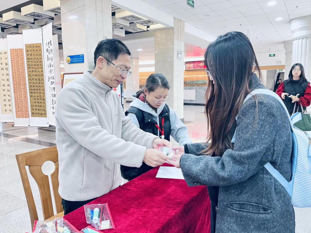 现场气氛热烈,关怀直达心底。活动现场气氛热烈而温馨:考生们有序排队领取礼包,脸上洋溢着惊喜与感动;志愿者们耐心引导、热情服务,用微笑传递温暖;书法协会成员的创作,每一笔都倾注着鼓励与支持。一位正在领取暖宝宝的考生说:“看到这些祝福,感觉备考的疲惫都减轻了不少,谢谢图书馆老师们的用心!”