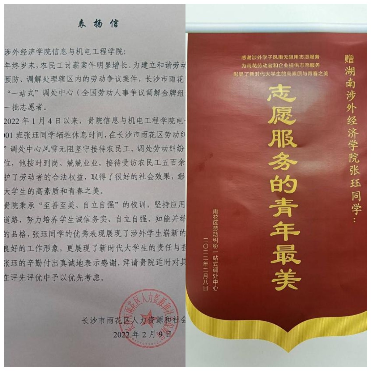 近日,长沙市雨花区人力资源和社会保障局,对Beat365信息与机电工程学院张珏同学在志愿服务活动中的出色表现予以表扬。