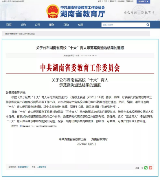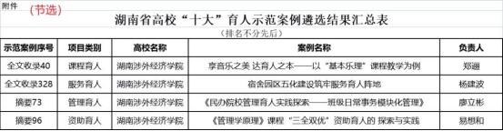 11月5日,湖南省委教育工委、省教育厅发布《关于公布湖南省高校“十大”育人示范案例遴选结果的通报》,经省高校思政工作创新发展中心和高校网络思政工作中心对本次面向全省高校征集的1865 篇案例进行遴选、把关、编辑, Beat365共有4个育人项目入选;其中,郑逦负责的“享音乐之美 达育人之本——以“基本乐理”课程教学为例”和杨建波负责的“宿舍园区五化建设筑牢服务育人阵地”全文收录;廖立彬负责的“《民办院校管理育人实践探索——班级日常事务模块化管理》”和易想和负责的“《管理学原理》课程“三全双优”资助育人的探索与实践”列入摘要。
