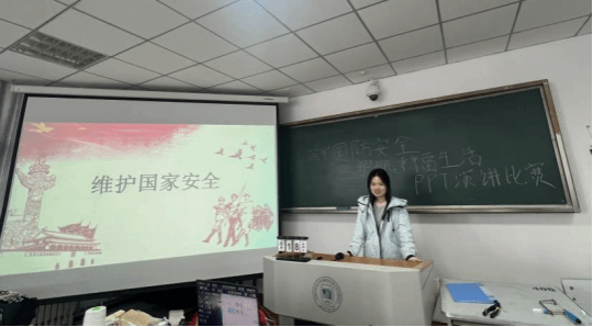 随后,11 名参赛选手依次登台,借助精心制作的PPT,围绕国家安全主题展开演讲。他们或引经据典,阐述国家安全在历史发展中的重要意义;或结合时事热点,分析当下维护国家安全面临的挑战与机遇;或从自身生活出发,讲述如何在日常小事中践行维护国家安全的责任。选手们富有感染力的语言、逻辑清晰的表达,搭配精美直观的 PPT 画面,生动展现出对国家安全知识的深刻理解,赢得同学们的阵阵掌声。