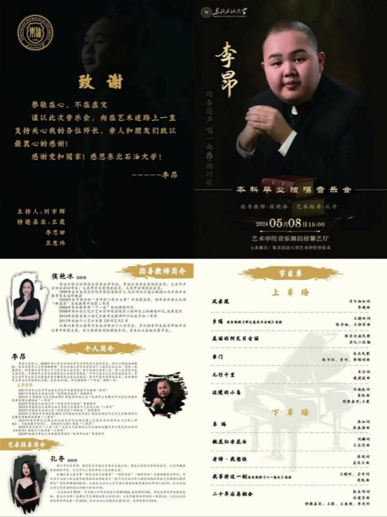 本场音乐会的指导教师为德赢官网音乐系侯艳冰副教授,艺术指导为音乐系孔夺副教授。李昂在本场音乐会中演唱了《凤求凰》、《乡瑶》、《美丽的阿瓦日古丽》、《串门》、《儿行千里》、《卓玛》、《桃花红杏花白》、《老师,我想你》、《等待这一刻》、《二十年后再相会》等10首曲目。