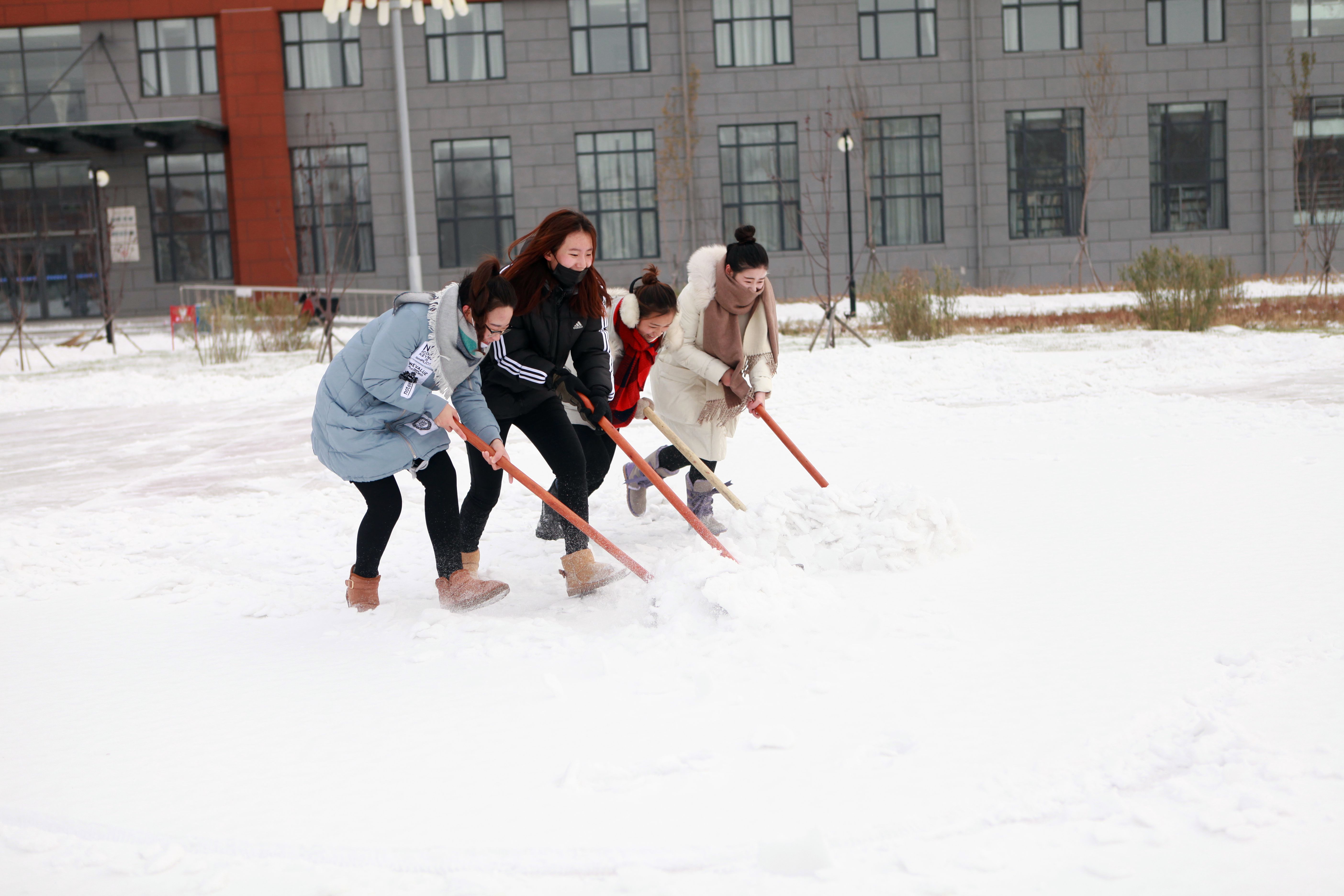 为确保全院师生的出行安全,学院第一时间组织领导干部、党员、教职工与学生进行清雪活动,分批对vwin德赢ac米兰官方网男女生寝室楼下以及教学楼前明德广场进行了清扫。冷冽的寒风和零下十几度的低温使扫雪工作异常艰难。“清雪突击队”的成员们手挥铁锹和扫帚,奋力铲雪、扫雪,用除雪板齐力推雪,老师和同学们的脸冻得通红,手指也冻的不灵活,但这一切并没有影响大家为校园服务的热情。