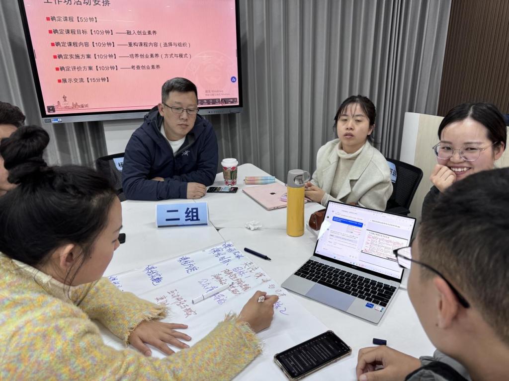 “专创融合校本课程设计工作坊”为参训教师提供了一个展示和交流的平台。在这里,教师们分为8小组进行了校本课程设计的实操练习,每组教师积极参与,热烈讨论,加强团队合作,大胆地将本组的设计理念和成果呈现给其他参与者,接受评议和建议,极大地提升了教师们的实战经验和团队协作能力。