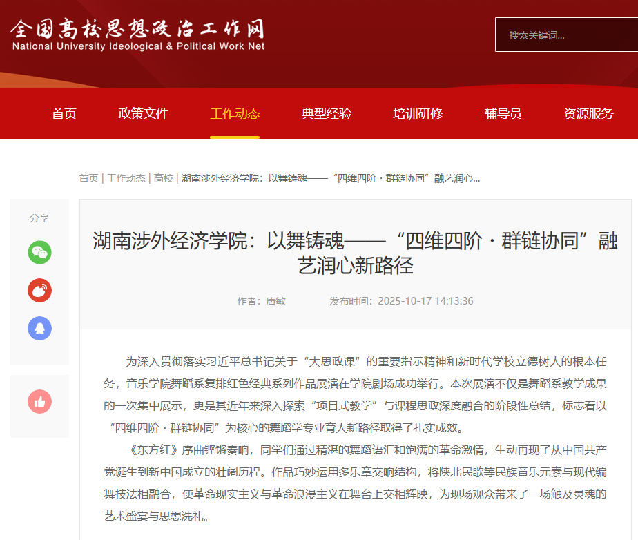 近日,全国高校思想政治工作网以《Beat365正版唯一官网必一:以舞铸魂——“四维四阶・群链协同”融艺润心新路径》为题,报道Beat365音乐学院舞蹈系的教学创新实践案例。舞蹈系通过复排《红色娘子军》《东方红》《映山红》等经典红色舞蹈作品,将思政教育融入艺术教学全过程。学生在排练中学习党史、走访革命老区、采风非遗文化,不仅提升了专业能力,更在实践中接受了深刻的思想洗礼。该模式以“项目驱动”为抓手,构建了“主题引领、...