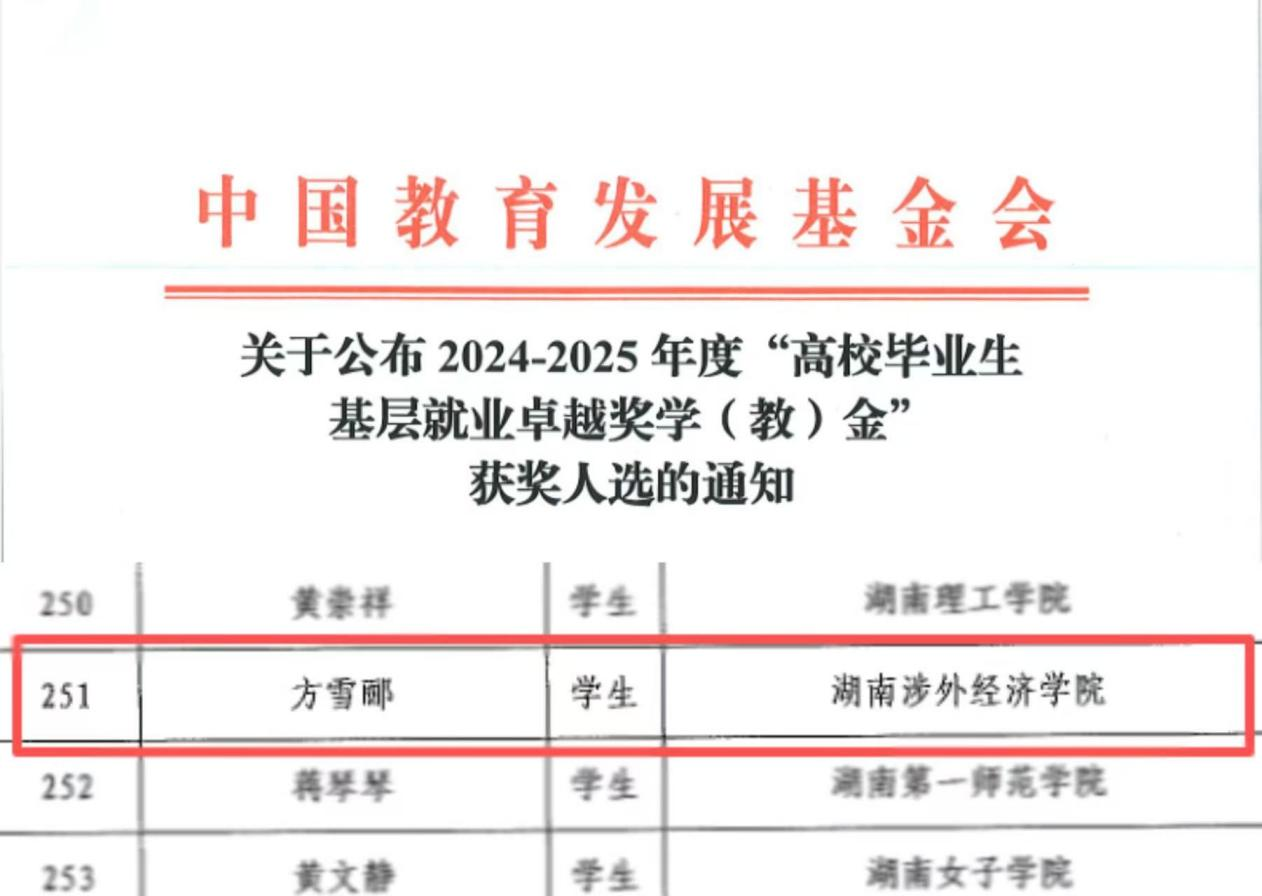 近日,中国教育发展基金会正式公布了2024—2025年度“高校毕业生基层就业卓越奖学(教)金”获奖名单。Beat3652020届毕业生方雪郦荣列其中,荣获国家级“高校毕业生基层就业卓越奖学金”。方雪郦同学是本年度全国获奖者中唯一一位来自民办本科院校的毕业生,充分彰显了Beat365在引导和支持毕业生投身基层、服务社会方面所取得的突出育人成效。这一奖项由教育部高校学生司(高校毕业生就业服务司)与中国教育发展基金会联合设立,旨...